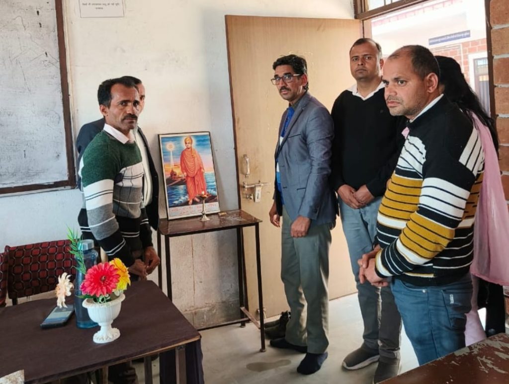स्वामी विवेकानंद की तस्वीर के सम्मुख महाविद्यालय प्राचार्य डॉ ज्ञान चन्द जांगिड़ के द्वारा दीप प्रज्जवलित करके किया गया।