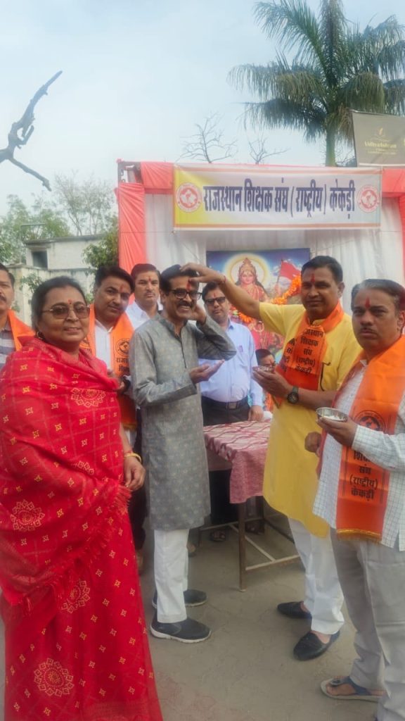 केकड़ी। भारतीय नव संवत्सर के अवसर पर राजस्थान शिक्षक संघ राष्ट्रीय उपशाखा केकड़ी द्वारा अभिनंदन कार्यक्रम का आयोजन किया गया। उपशाखा अध्यक्ष मोजेन्द्र सिंह राव के नेतृत्व में संगठन के कार्यकर्ताओं ने राजकीय बालिका उच्च माध्यमिक विद्यालय केकड़ी के सामने राहगीरों का तिलक लगाकर एवं प्रसाद वितरण कर नव संवत्सर की हार्दिक शुभकामनाएं दीं।